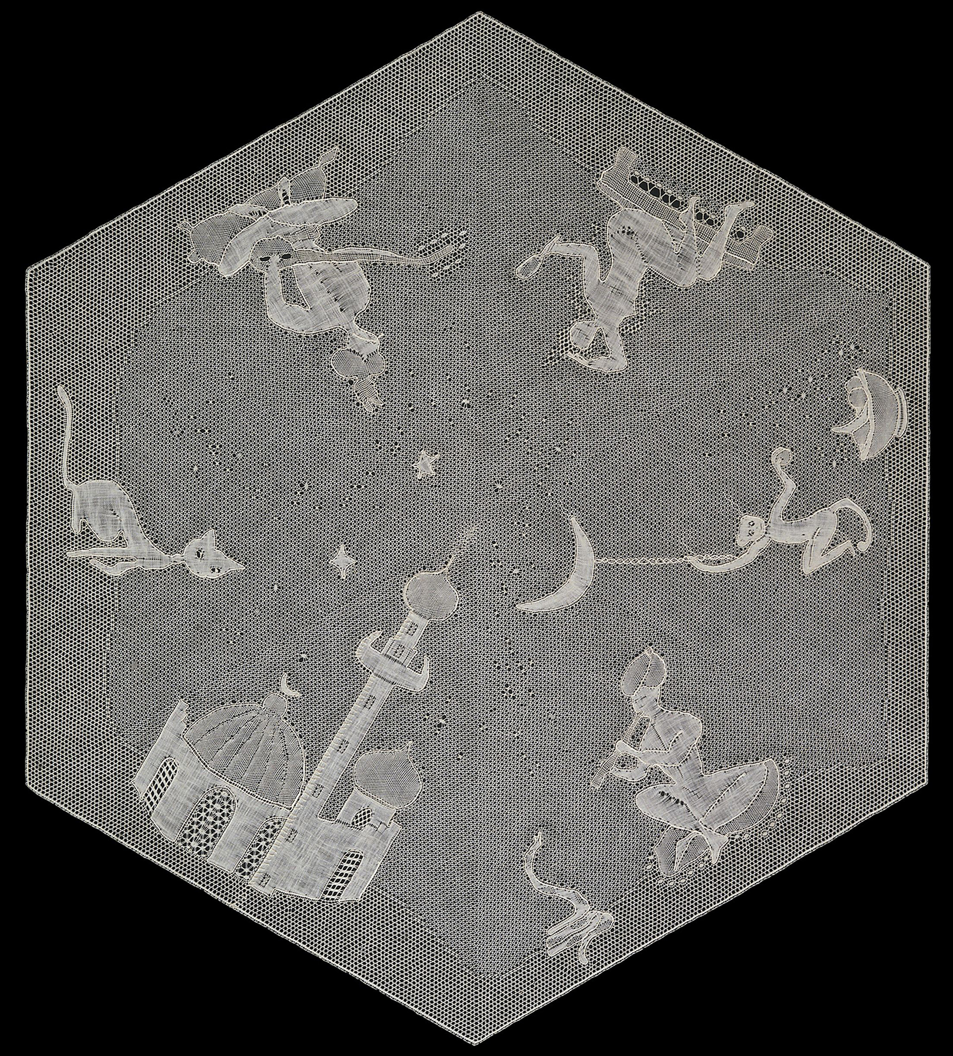 Die Zeichnungen auf dem Porzellan „1001 Nacht“ der Porzellanmanufaktur Meißen regten mich an, eine passende Mitteldecke zu entwerfen. Ursel Lossin klöppelte diese aufwendige Spitze.